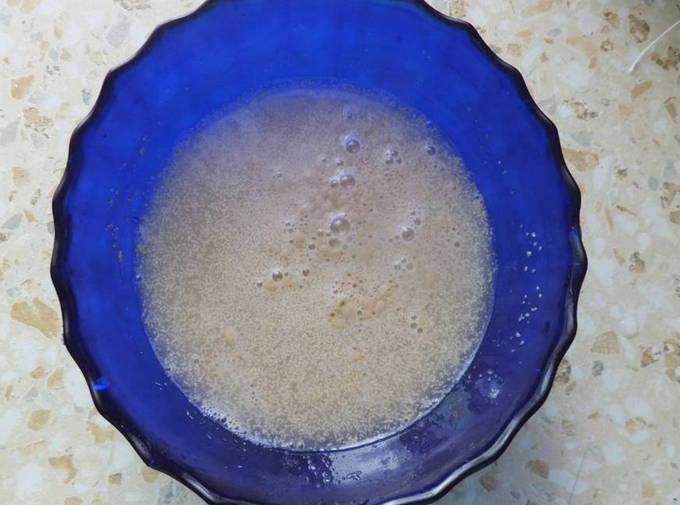 - Roer suiker en droge gist in warm water. We laten het werkstuk 10 minuten staan.