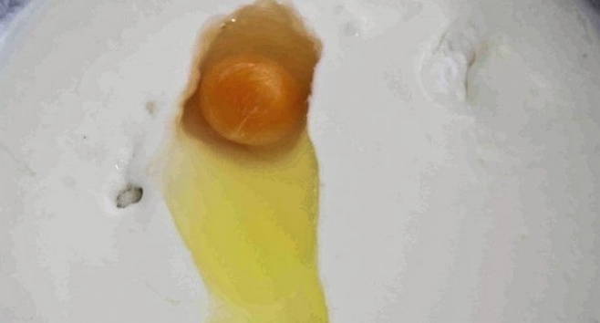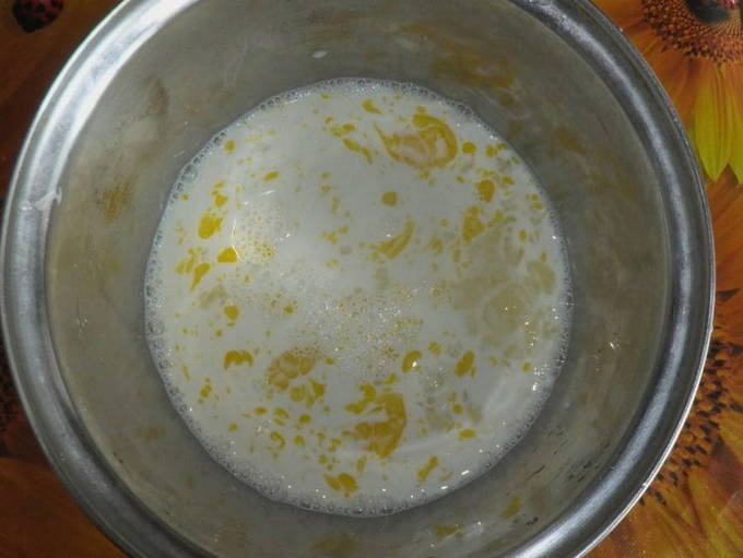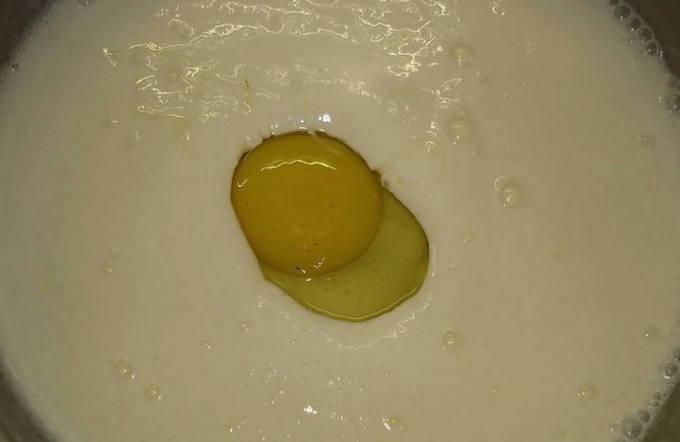 - Giet melk in een aparte kom. We breken een ei en zout erin. We beginnen te kneden.