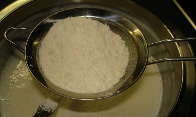 - Voeg gezeefde bloem en een snufje zout toe. Roer het beslag totdat de klontjes breken.