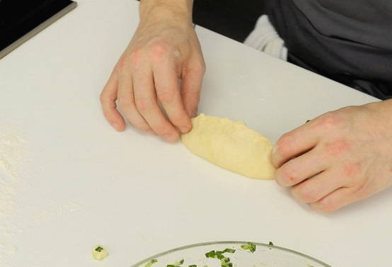 - We kneden elk tot een cake, in het midden waarvan we de vulling verspreiden.