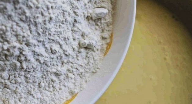 - Meng twee soorten bloem, bakpoeder en soda. We maken een kleine depressie in het mengsel en gieten hier water.