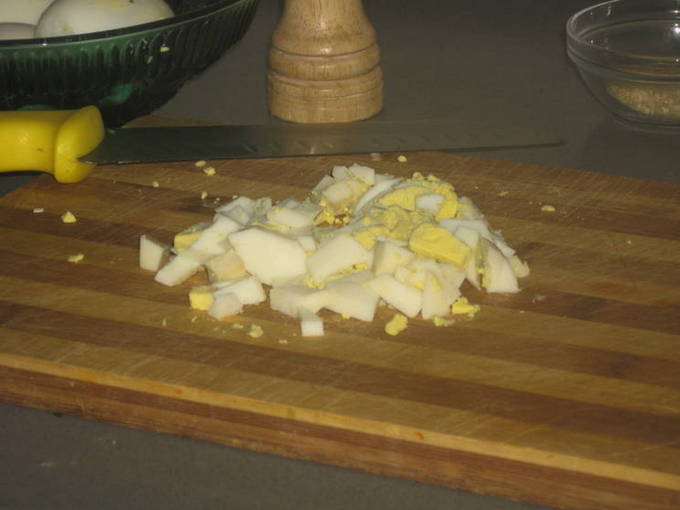 - We voegen ook fijngehakte gekookte eieren toe.