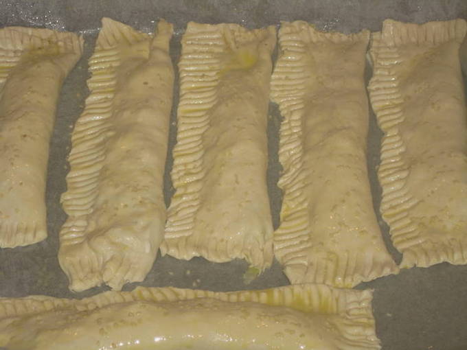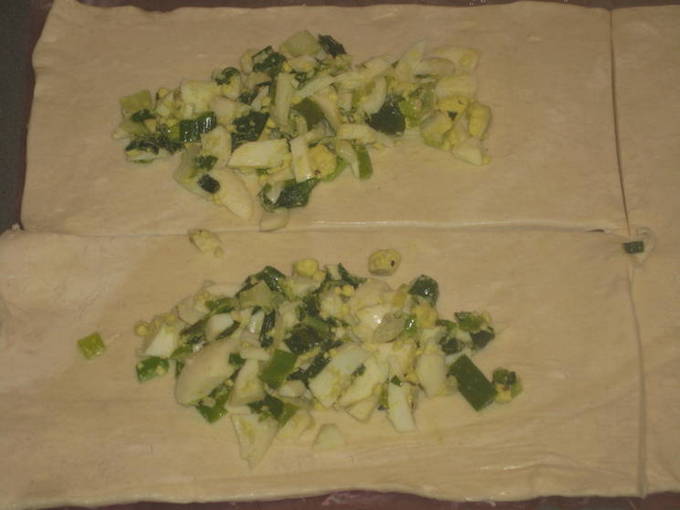 - Verdeel het ontdooide deeg in kleine rechthoeken. Leg de vulling in het midden.