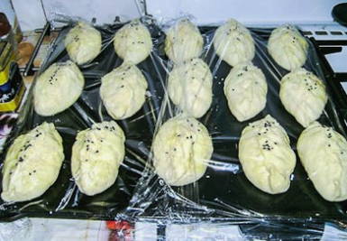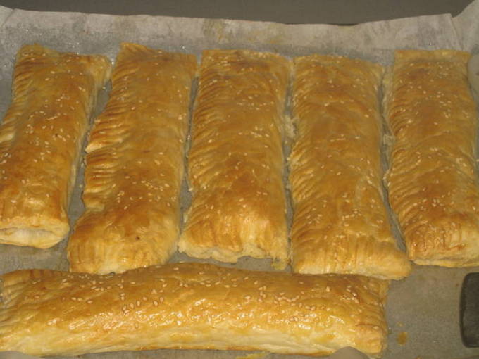 - Voeg de vulling toe, vorm de pasteitjes en leg ze op een bakplaat. Bedek ze met losgeklopt ei en bestrooi met sesamzaadjes naar smaak.