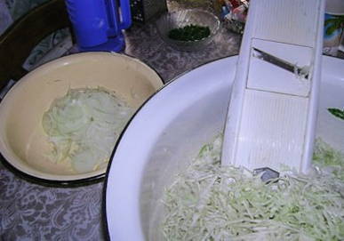 - Rasp witte kool met dunne reepjes. Snijd de uien in dunne halve ringen.