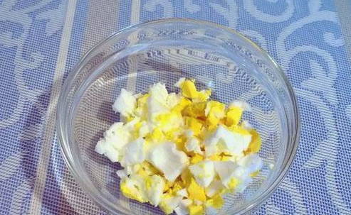 - Pel de gekookte eieren en snijd ze in blokjes. We leggen ze in een diep bord.