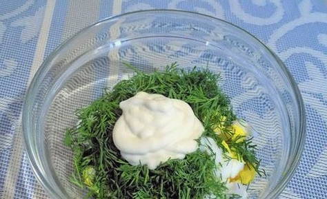 - Voeg hieraan fijngehakte gekookte eieren toe. Schenk de mayonaise erbij en meng goed.