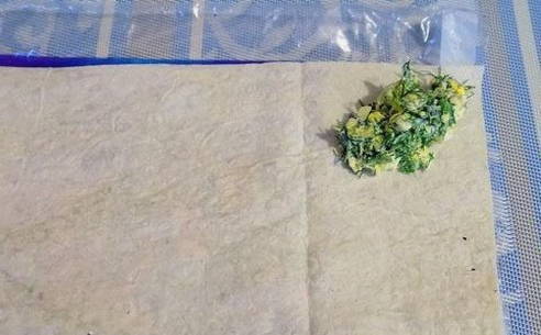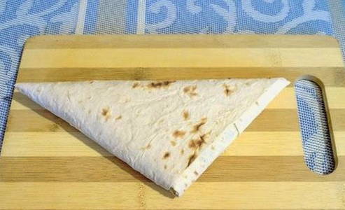 - Verdeel de lavashvellen in rechthoeken. Leg de vulling in de hoek van elk.