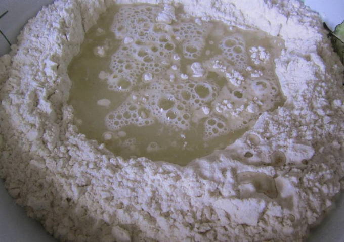 - Voeg er zout, droge gist, olijfolie en gezeefde bloem aan toe.