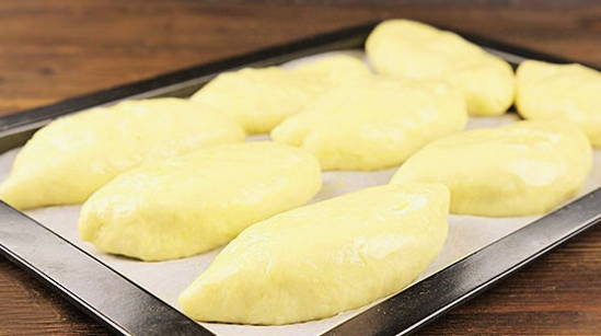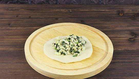 - Verdeel het afgewerkte deeg in stukken. We boetseren elk in een cirkel en vullen het met vulling.