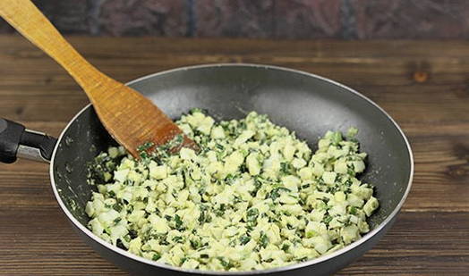 - Maal voor de vulling gekookte eieren, groene uien en geraspte kaas. Roer de producten tot ze gelijkmatig verdeeld zijn.