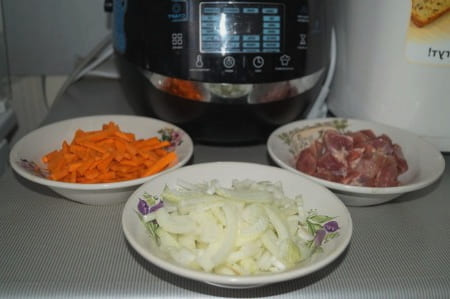 - Bestrijk de multicooker-kom grondig met plantaardige olie. We leggen er vlees, uien en wortelen in.Zout en meng de producten.