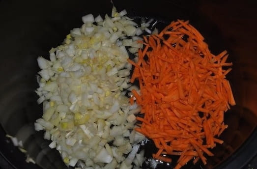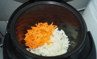 - Zet de multicooker in de "Fry" -modus, giet er een beetje groente in en bak de uien en wortels gedurende 5 minuten.