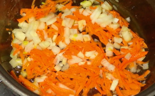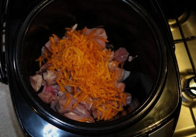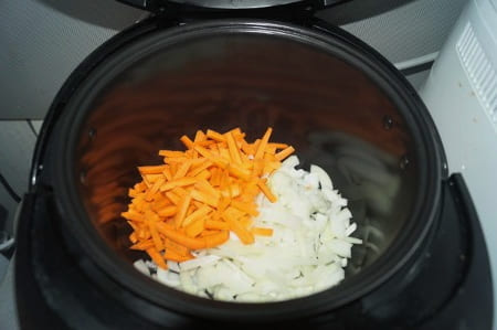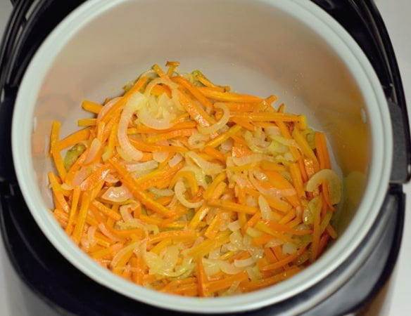 - Wrijf de wortelen grof en doe ze samen met de uien in een voorverwarmde multikoker. U moet eerst plantaardige olie toevoegen.