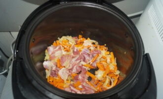 - Giet plantaardige olie in de kom van de multikoker. We zetten de modus "Multipovar" aan, stellen de temperatuur in op 160 graden. Bak eerst de ui, voeg dan de wortelen toe en dan het varkensvlees. Zout en kook gedurende 10 minuten.