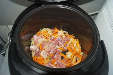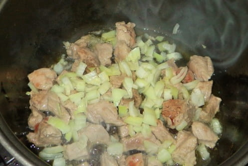 - Snijd het varkensvlees in kleine blokjes en bak in olie 10 minuten tot ze knapperig zijn. Kan in een koekenpan of direct in de multicooker bowl.