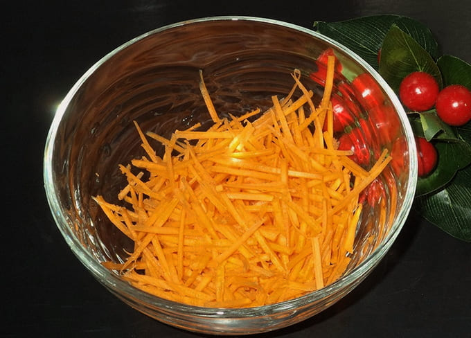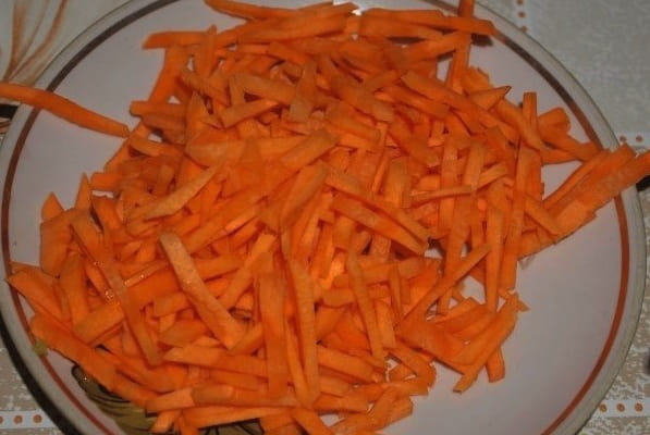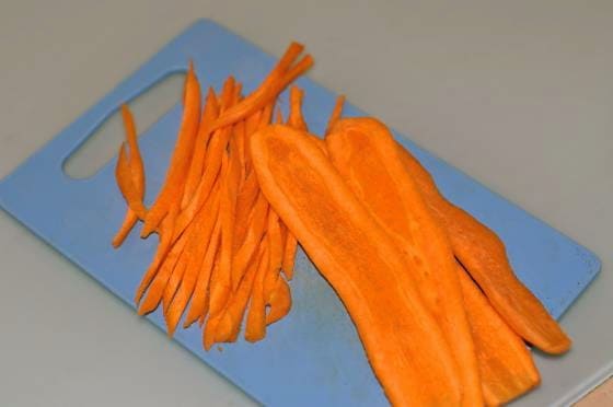 - We maken de wortels schoon en snijden ze in dunne reepjes. Het is handig om dit te doen met een groentesnijder.