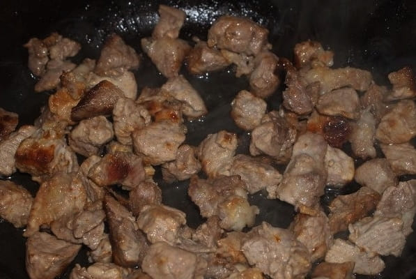 - Verdeel het varkensvlees in kleine blokjes. Het is het beste om tegen de stroom in te snijden.