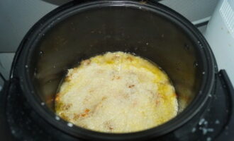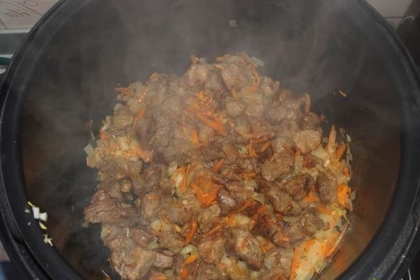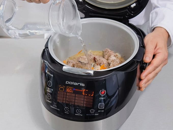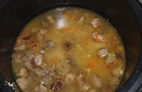 - Vul dit alles met water. We zetten de "Pilaf" -modus aan en wachten ongeveer een uur op gereedheid.