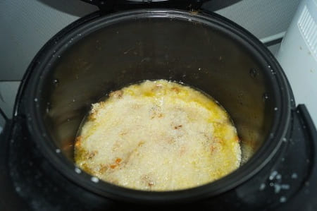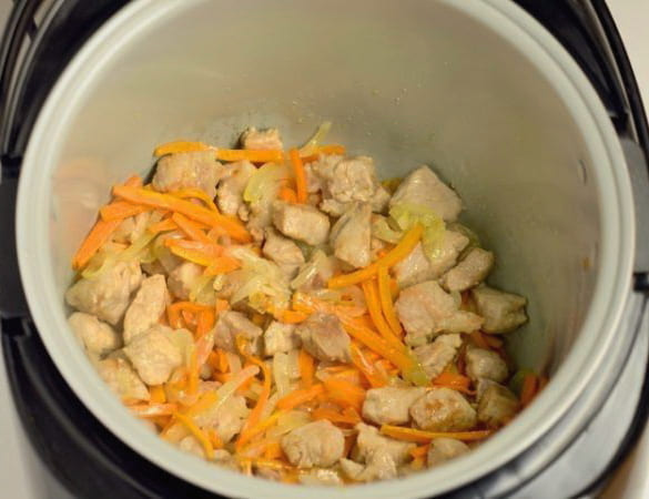 - Kruimelige pilaf met varkensvlees in een Redmond slowcooker