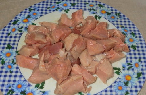 - Ontdooi het varkensvlees van tevoren, spoel het af en snijd het in gelijke kleine blokjes.