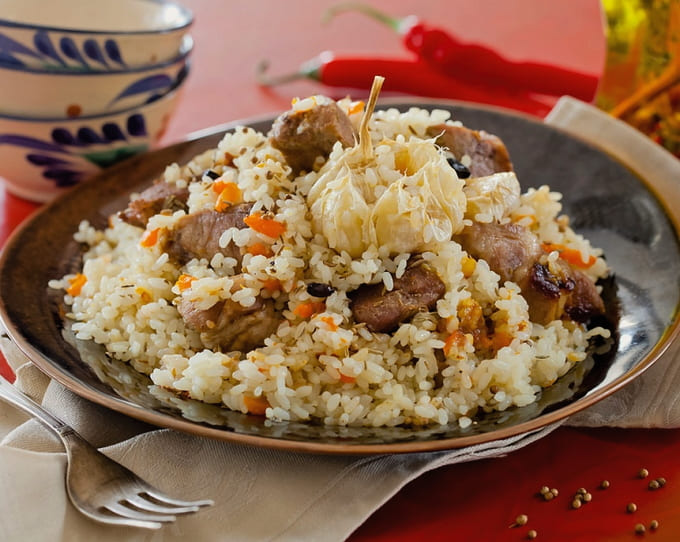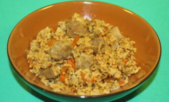 - Leg de afgewerkte pilaf met varkensvlees op borden en serveer warm. Eet smakelijk!