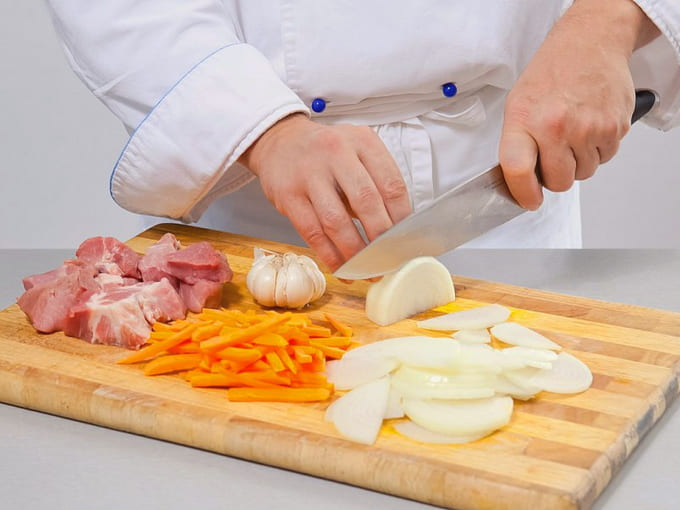 - Snijd het vlees tegen de vezels in middelgrote stukken. Snijd de ui in dunne halve ringen, wortelen in kleine reepjes. Het is voldoende om de knoflook af te spoelen en de bovenste laag van de schil af te pellen.