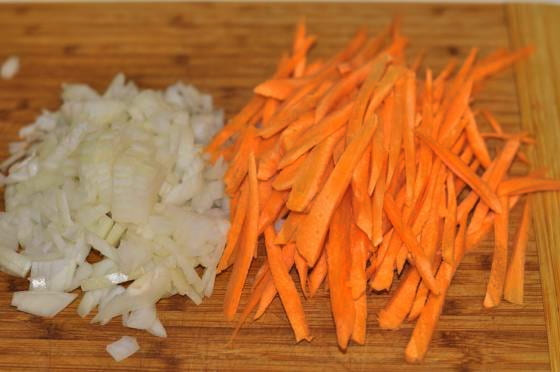 - Ga na de wortelen verder met de ui. We maken het schoon en snijden het vervolgens in kleine stukjes.