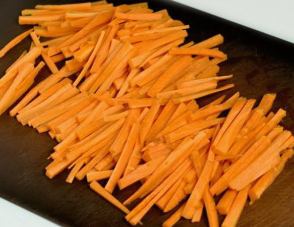 - Snijd de wortel in dunne korte reepjes.