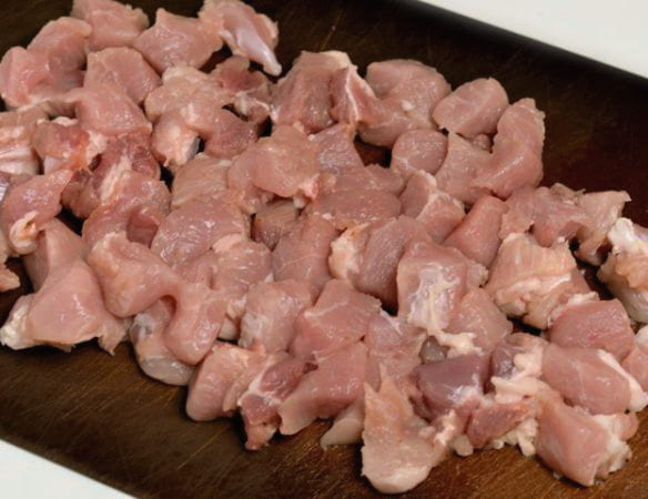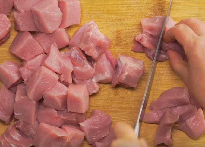 - Snijd het varkensvlees in middelgrote blokjes. Het is belangrijk om het vlees tegen de vezels aan te snijden.