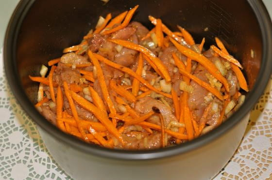 - We bestrijken de multicooker-kom met olie. We verspreiden het vlees en de wortelen. Vul de rijst, vul hem met water. Zout, bestrooi met kruiden en schakel de "Pilaf" -modus in.