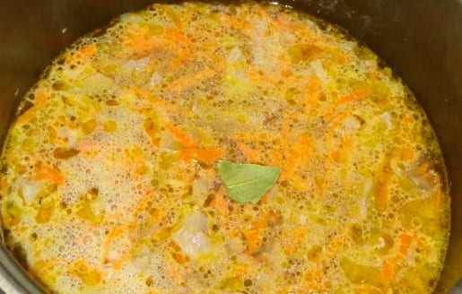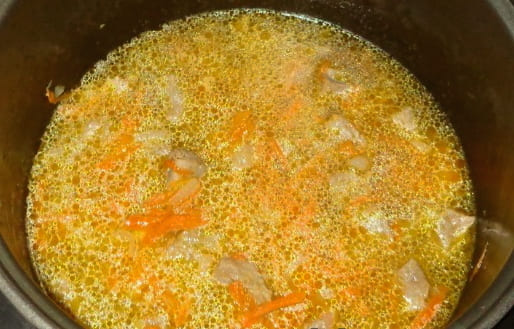 - Nadat de groenten zacht zijn, hakt u het varkensvlees fijn en doet u het ook in de multicookerkom.