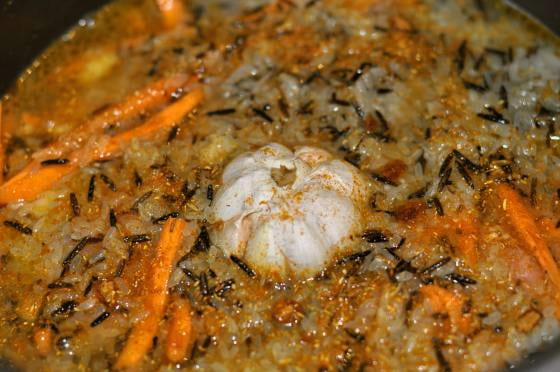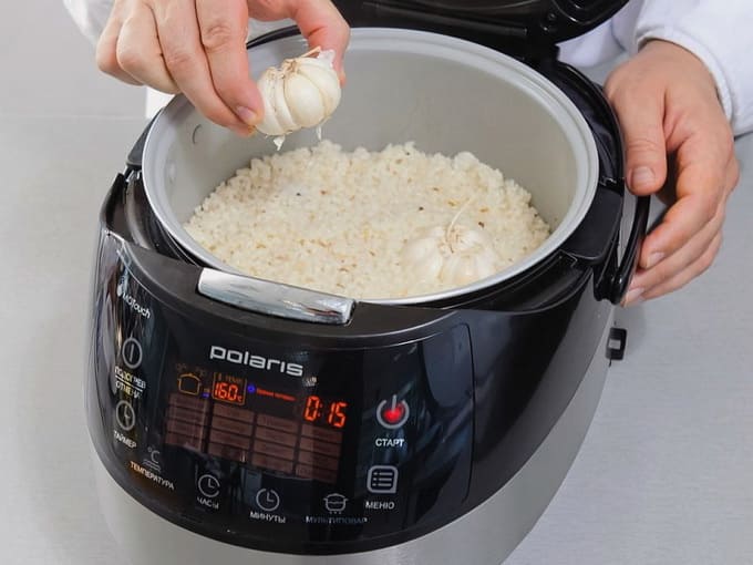 - Verdeel de rijst in een gelijke laag. Indien nodig kunt u nog wat water toevoegen. Leg de knoflook erop, sluit het deksel en kook het gerecht 50 minuten.