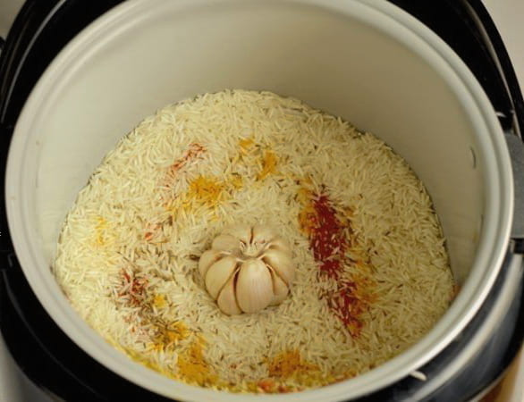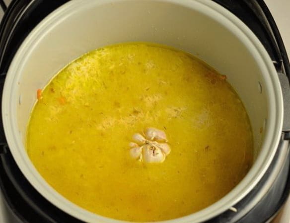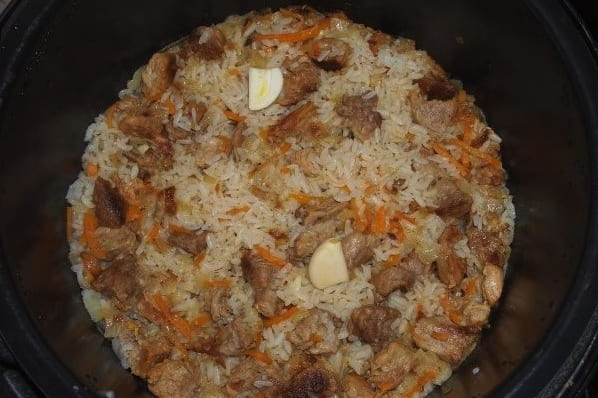 - Als het programma afgelopen is, leg je de gepelde knoflookteentjes in de pilaf. Sluit het deksel en laat het 10 minuten trekken.