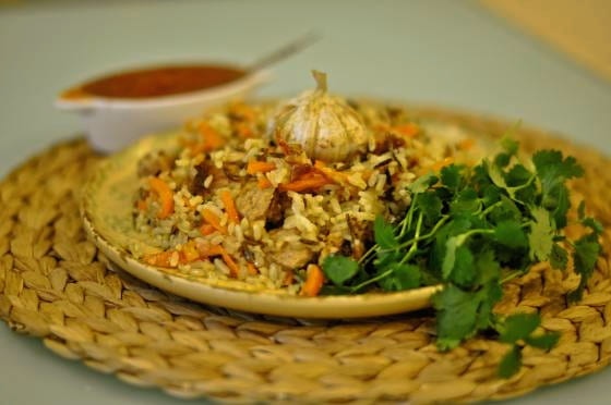 - Als het programma is afgelopen, is de varkenspilaf klaar. We halen het uit de kom, zetten het op borden en serveren het op tafel.