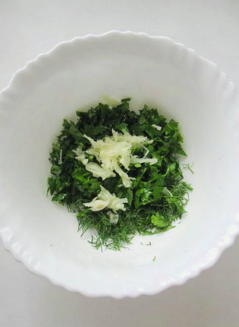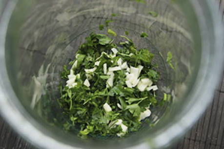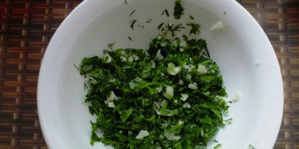 - Was de greens en hak ze fijn. Haal de knoflook door een pers. Combineer kruiden en knoflook.