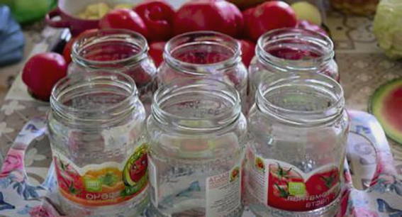 - Schik de tomaten in gesteriliseerde potten. Giet kokend water in de potten, laat 10 minuten staan, herhaal deze procedure opnieuw.