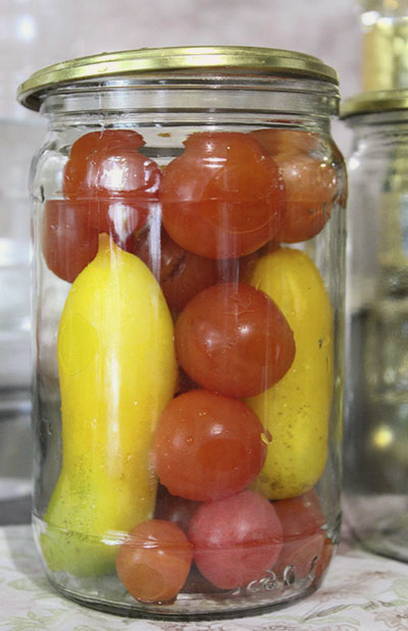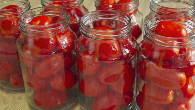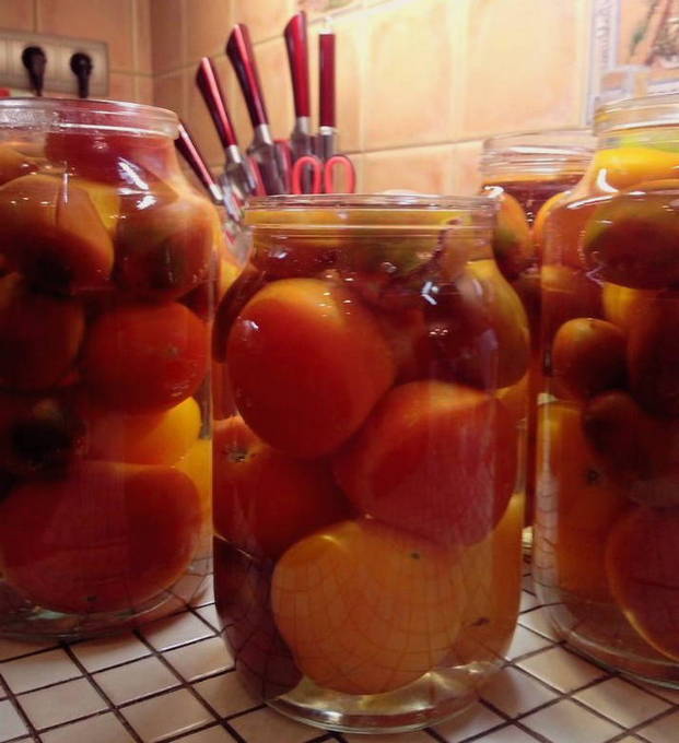 Tomaten op eigen sap zonder azijn kunnen ook bij kamertemperatuur de hele winter goed bewaard worden. Voor het inblikken op deze manier is het beter om pruimtomaten te selecteren.