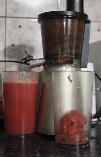 - Gebruik rijpe tomaten om tomatensap te maken. Gebruik een sapcentrifuge om sap te maken. Of rol ze door een vleesmolen en knijp de opgevouwen kaasdoek er na een paar keer uit.