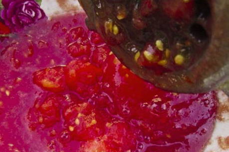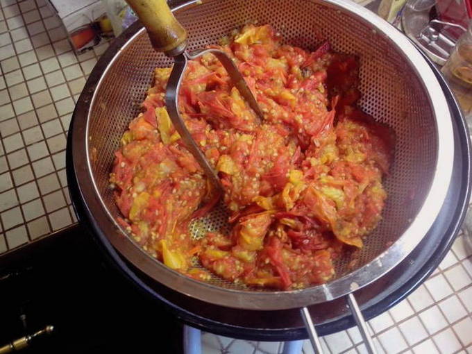 - Wrijf de gehakte tomaten door een vleesmolen.Wrijf het mengsel door een zeef om zaden en velletjes te verwijderen.
