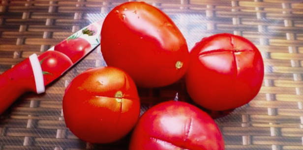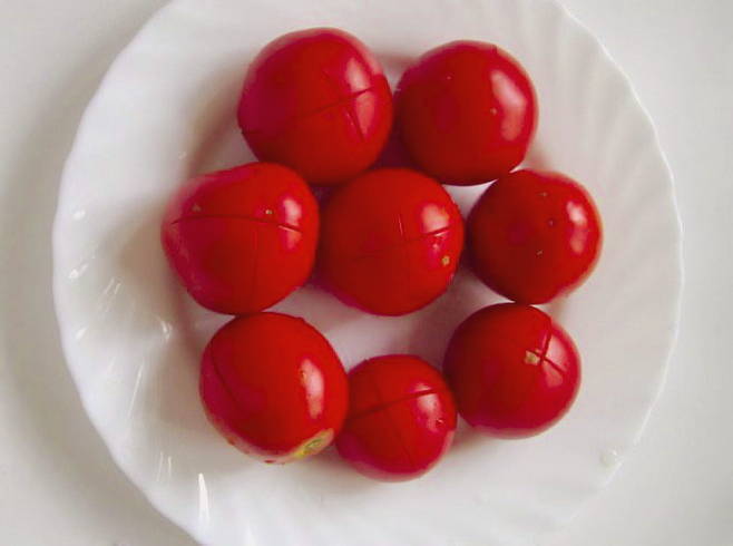 - Maak kruissneden in de tomaten.