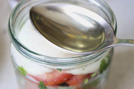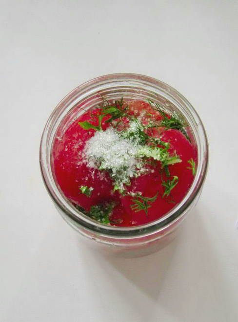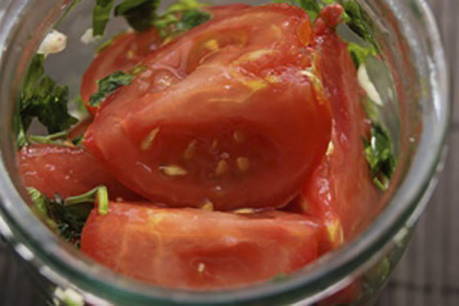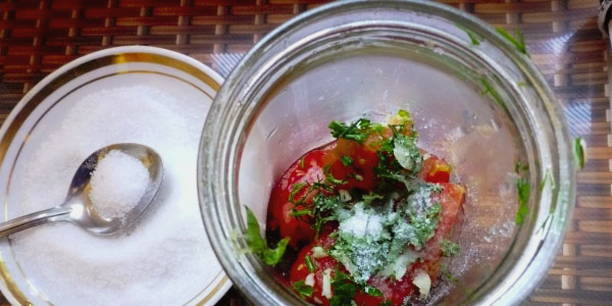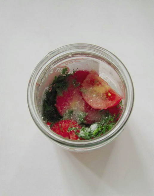 - Steriliseer nadenpotten. Doe de plakjes tomaat in potten, bekleed ze met kruiden en bestrooi ze met zout en suiker.