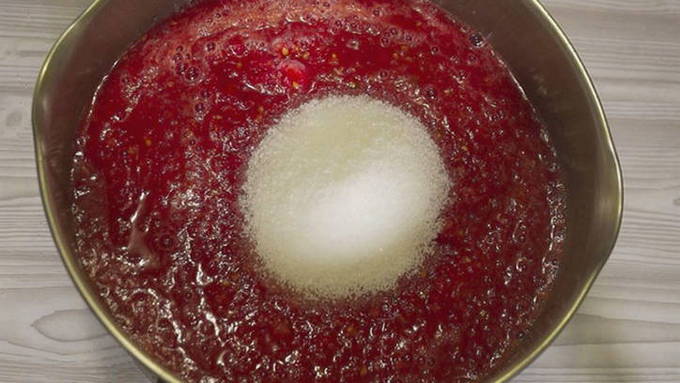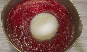 - Veeg vervolgens de resulterende tomatenmassa door een fijne zeef. Leg daarna het tomatensap op het vuur, breng aan de kook, voeg zout en suiker toe, kook 15-20 minuten.