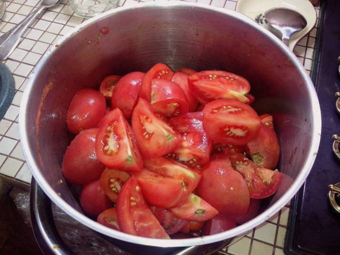 - Was de tomaten goed. Snijd ongeveer 2 kilo tomaten die voor de saus zullen worden gebruikt.