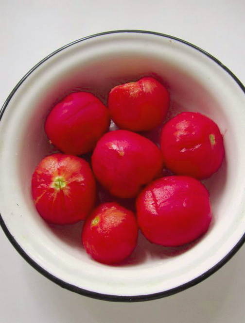 - Dompel de tomaten 3-4 minuten in kokend water, leg ze onmiddellijk in ijswater en schil ze.