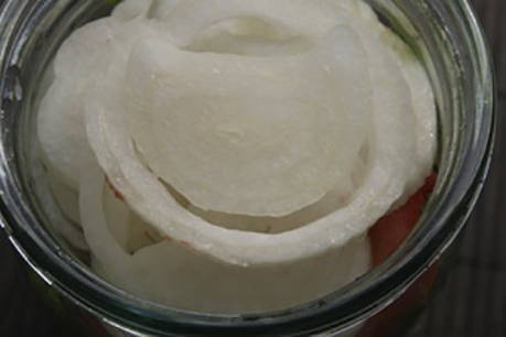 - Was groenten en kruiden. Hak de knoflook en kruiden, hak de ui in ringen. Leg wat kruiden, knoflook en uien op de bodem van de gesteriliseerde pot.