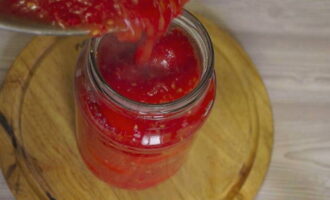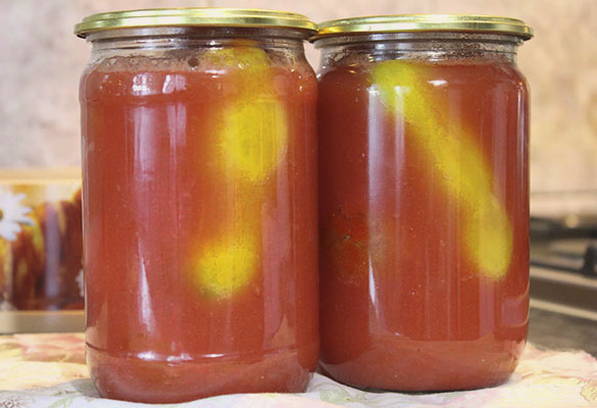 - De tweede keer, giet het water af en giet onmiddellijk kokend tomatensap in de potten, rol de potten op met steriele deksels. Wikkel de potten in een deken en laat ze afkoelen. Bewaar naaiwerk op een koele plaats.