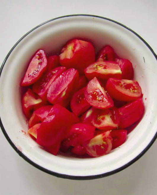 Volgens dit recept doen tomaten in hun eigen sap niet onder voor verse in smaak. Tomaten worden geschild, in partjes gesneden en bewaard in tomatensap.