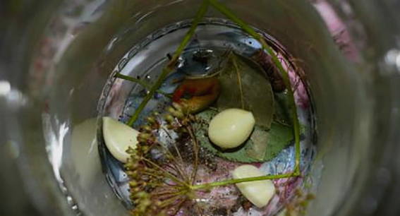 - Doe laurierblaadjes, dilleparaplu's, kersenbladeren, kruidnagel, paprika en knoflook in potten.