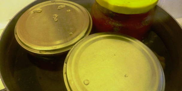 - Bedek de potten met deksels en steriliseer gedurende 10-15 minuten in kokend water.